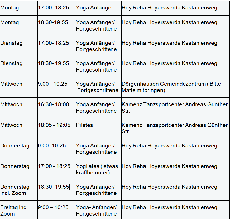 Meine Yogakurse finden in der Hoy Reha Hoyerswerda, in Dörgenhausen und in Kamenz statt, den aktuellen Kursplan findest du hier https://dagmarsteuer.de/yoga-und-pilates/